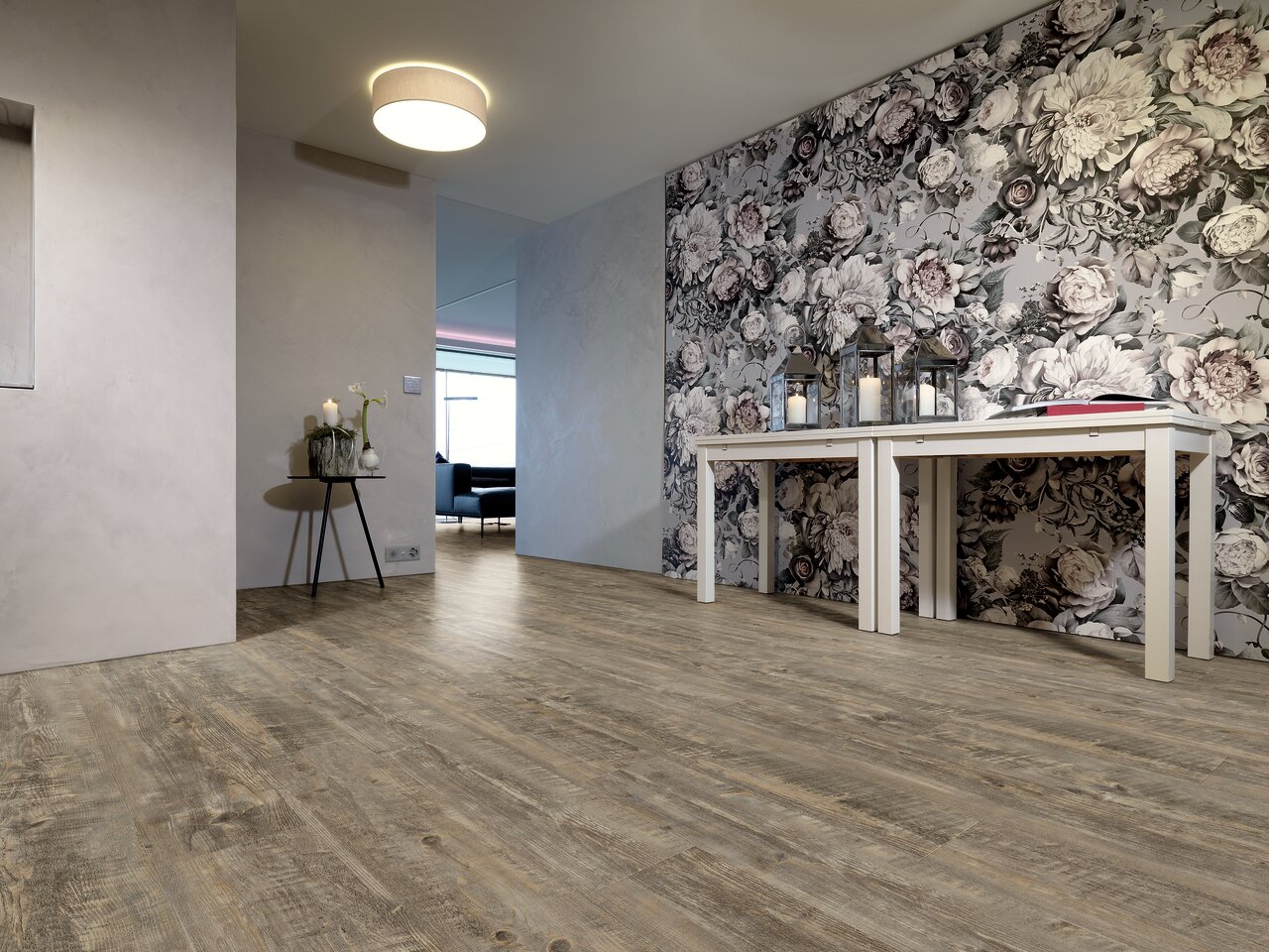 Designbelag in Holzoptik mit einer matten Oberfläche und einer erhöhten Rutschhemmstufe R10 sowie einer 4-seitigen Microfase zur vollflächigen Verklebung. Dieser Designbelag ist in 11 verschiedenen Eiche Dekoren erhältlich.