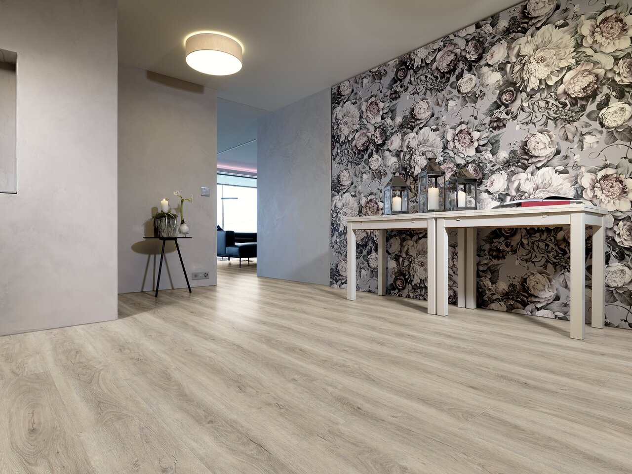 Designbelag in Holzoptik mit einer matten Oberfläche und einer erhöhten Rutschhemmstufe R10 sowie einer 4-seitigen Microfase zur vollflächigen Verklebung. Dieser Designbelag ist in 11 verschiedenen Eiche Dekoren erhältlich.