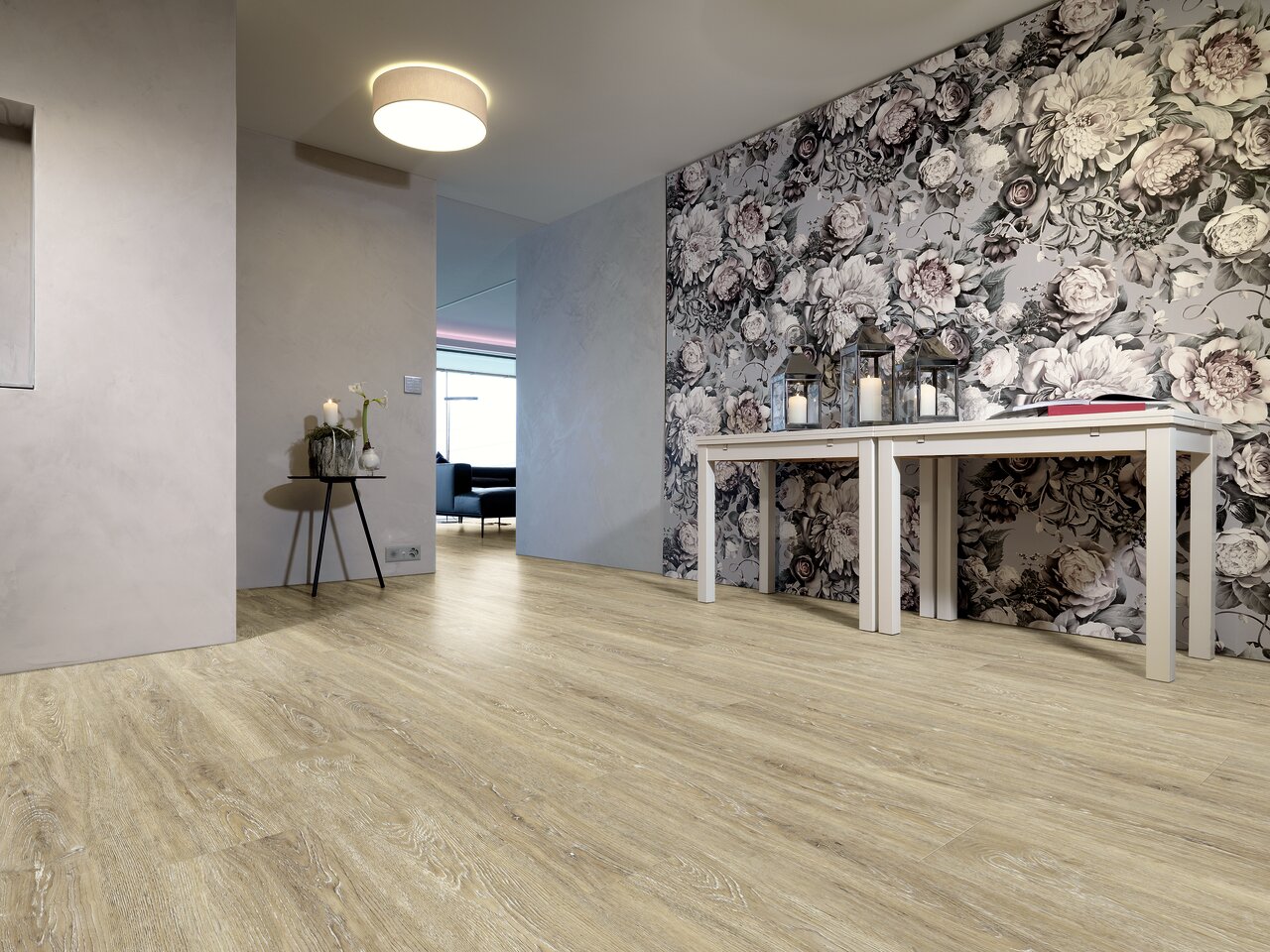 Designbelag in Holzoptik mit einer matten Oberfläche und einer erhöhten Rutschhemmstufe R10 sowie einer 4-seitigen Microfase zur vollflächigen Verklebung. Dieser Designbelag ist in 11 verschiedenen Eiche Dekoren erhältlich.