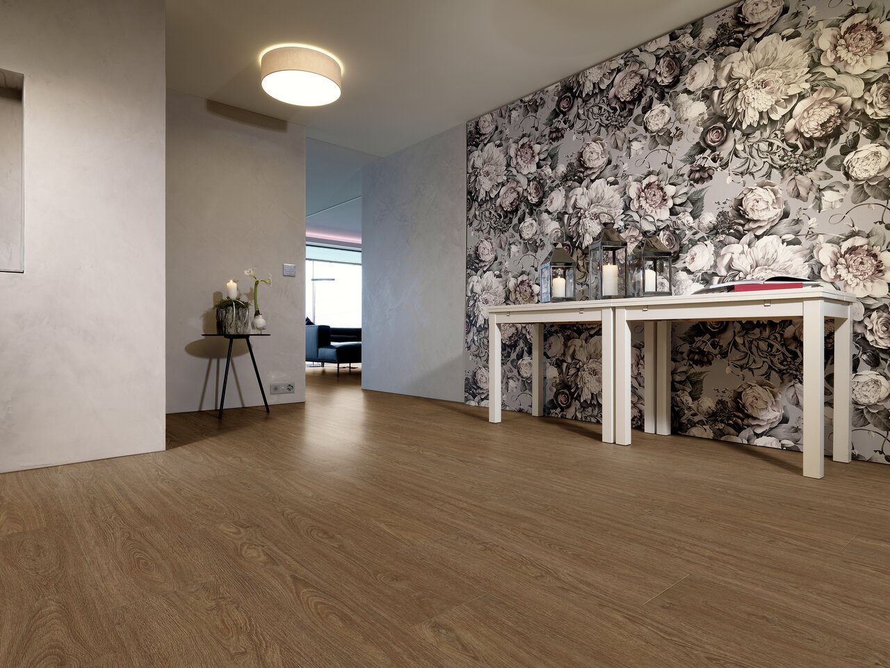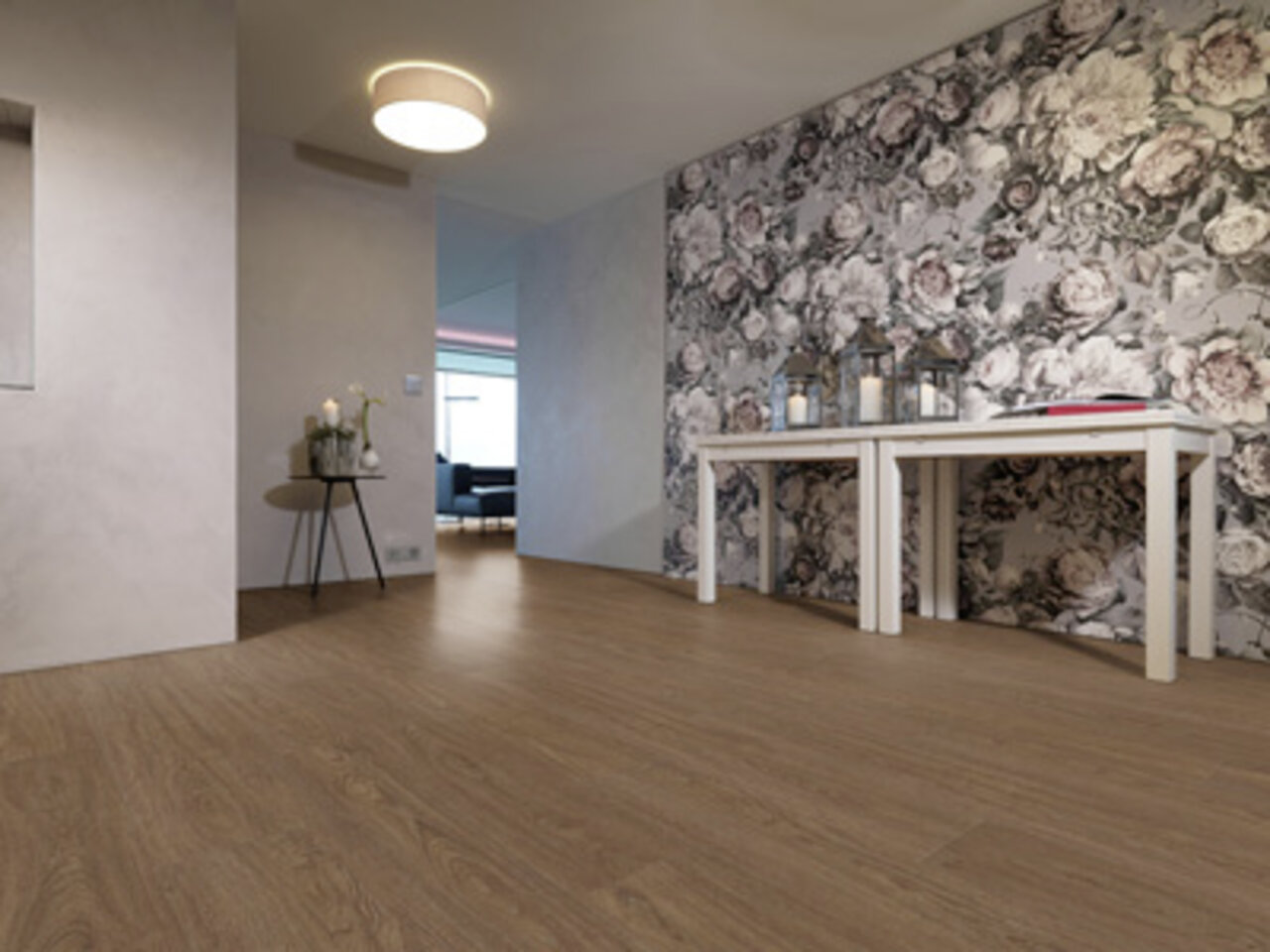 Designbelag in Holzoptik mit einer matten Oberfläche und einer erhöhten Rutschhemmstufe R10 sowie einer 4-seitigen Microfase zur vollflächigen Verklebung. Dieser Designbelag ist in 11 verschiedenen Eiche Dekoren erhältlich.