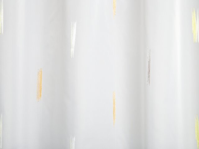 Gewebter, transparenter, leicht glänzender Store in der Grundfarbe Weiß mit orange, beige, grün und grauen Elementen