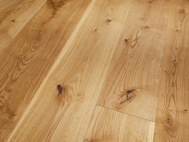 Attraktives Fertigparkett in Landhausdielen, mit einer Deckschicht aus Eichen Massivholz in naturgeölt. Das Parkett verfügt über ein Automatic-Click System und lässt sich spielend leicht verlegen. Alltagstauglich und pflegeleicht bietet das überzeugende Naturprodukt vielfältige Gestaltungsspielräume. Diese Dielen verfügen über eine umlaufende Minifase, die die Optik der verlegten Dielen dezent unterbricht und die typische Parkettoptik unterstreicht. Die Sortierung Rustikal wirkt wegen ihrer astigen Optik, des ausgeprägten Farbspiels und der deutlichen Maserung besonders ursprünglich. Der Parkettboden ist sogar für eine Verlegung auf Fußbodenheizungen geeignet.
