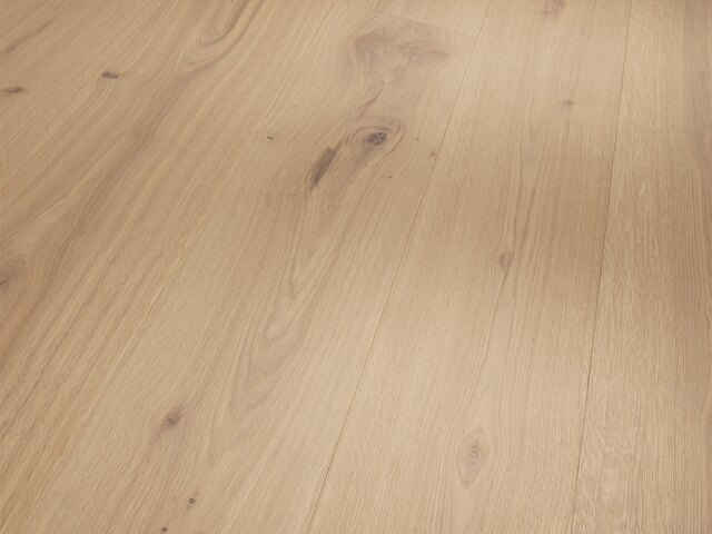 Attraktiver Parkettboden in Landhausdielen-Optik, mit Deckschicht aus Eichen-Massivholz in naturgeölt weiß und einem Automatic-Click System für eine spielend leichte Verlegung. Die Dielen verfügen über eine umlaufende Minifase, die die Optik der verlegten Dielen dezent unterbricht und die typische Parkettoptik unterstreicht. Die Sortierung Rustikal wirkt wegen ihrer astigen Optik, des ausgeprägten Farbspiels und der deutlichen Maserung besonders ursprünglich. Der Parkettboden ist für eine Verlegung auf Fußbodenheizung geeignet.