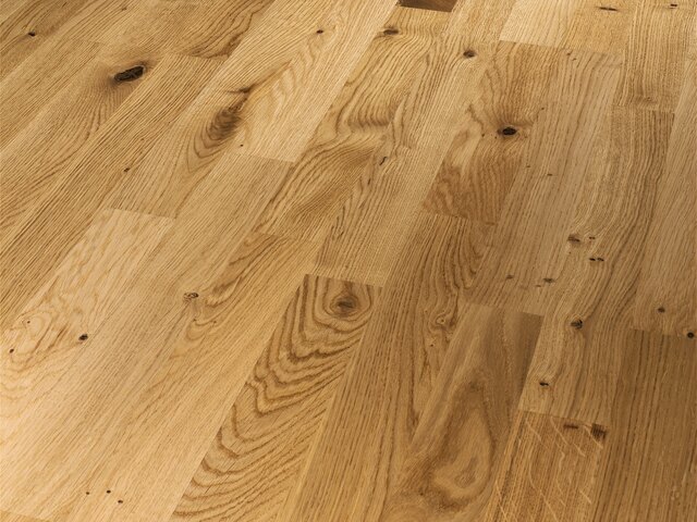 Rustikaler, zeitloser 3-Schicht-Fertig-Parkettboden ohne Fugenbild in 3-Stab Schiffsboden-Optik mit Click-System für eine einfache Verlegung. Dieses matt lackierte, astige Eichen-Fertigparkett erhält durch seine fasenlose Verlegung ein harmonisches Bild, das Ihnen einen geschlossenen Gesamteindruck bietet. Dieser Parkettboden ist sogar für eine Verlegung auf Fußbodenheizung geeignet.