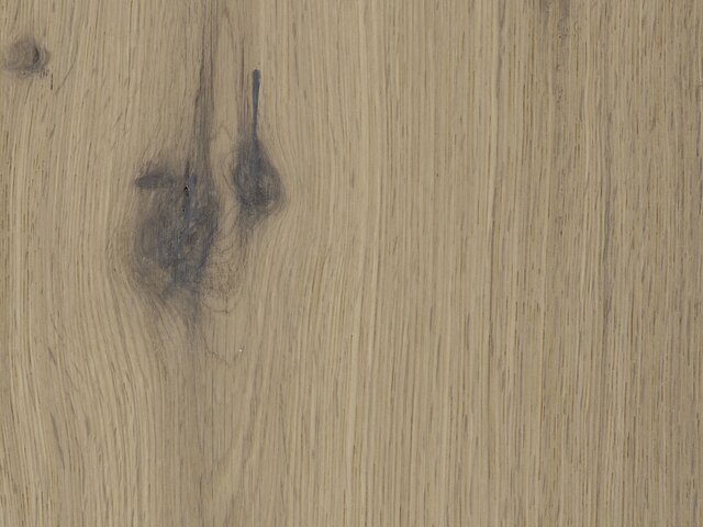 Die zart weiße 3-Schicht-Landhausdiele mit ausdrucksstarker, astiger Sortierung schafft eine natürliche Wohnatmosphäre. Die Oberfläche ist gebürstet, geräuchert und weiß geölt bei einer Dielenlänge von ca. 1.900 mm.