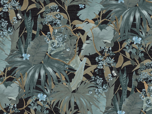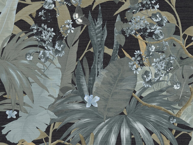 Vliestapete mit imposantem Blätter-Blumen-Muster mit Dschungel-Anmutung auf schwarzem Fond. Dem Betrachter bietet sich ein lebendiges Naturschauspiel, voller Kraft und Energie.